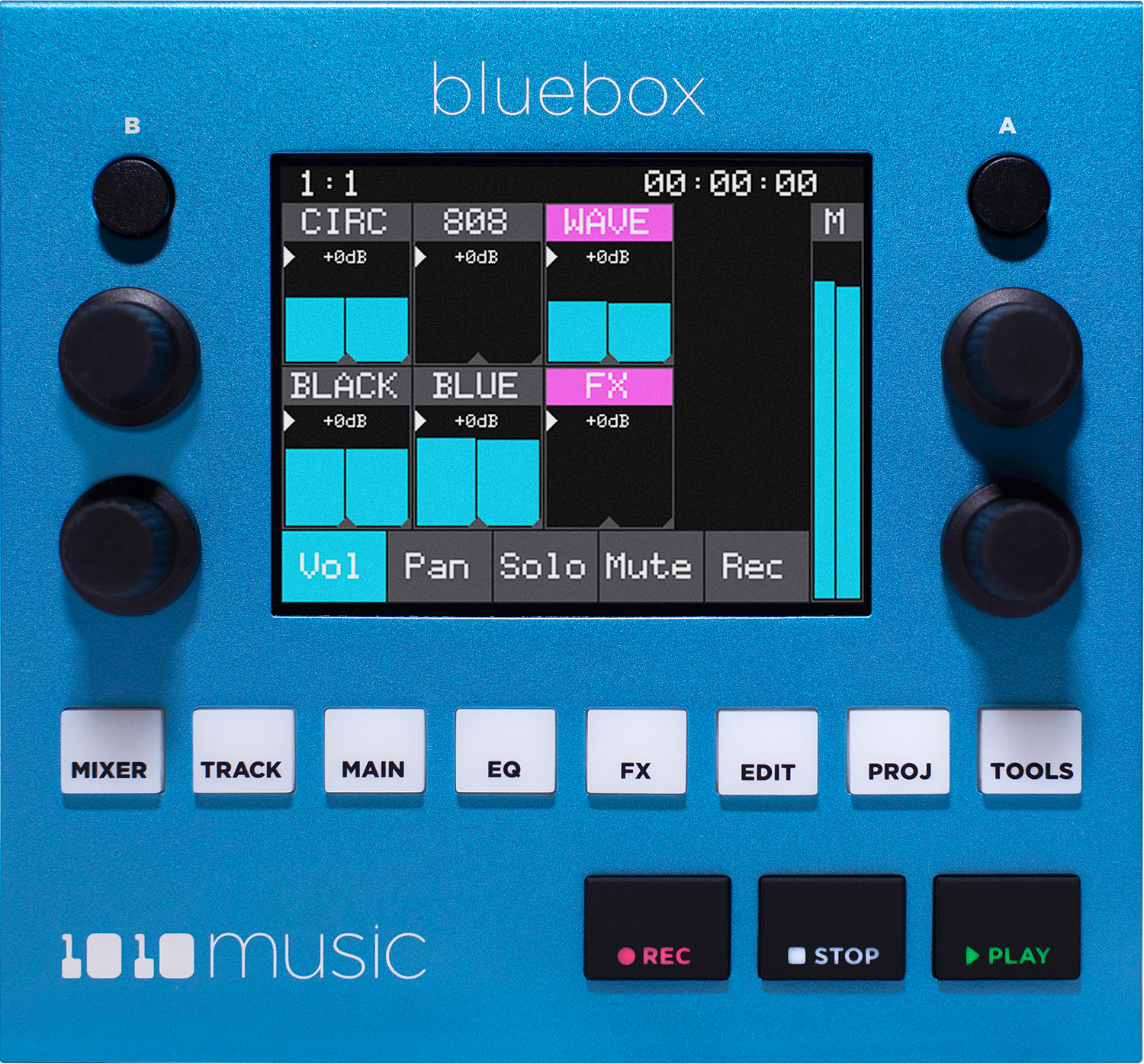 connect the output of your electronic music gear to bluebox, and then route each track independently to the three outputs and effects sends. each track offers control of volume, gain, 4 band parametric eq,