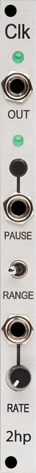 clk is a voltage controlled clock generator with all of the features a master clock needs. it has an extremely wide range from ten seconds between pulses well into audio rate. in addition, the pause button