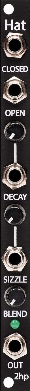 open and closed allow for a complete hi- hat pattern on a single module. no matter what situation it's in, hat provides shimmering, metallic timbres for any percussive purpose.