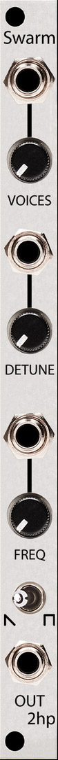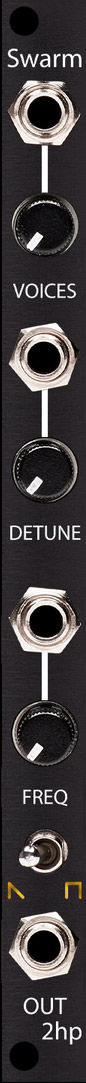 thickening of sound to atonal choas in the turn of a knob! swarm also provides macro pitch control with the freq knob, which also tracks 1v/oct through its cv input. a waveform toggle is also available for switching between sawtooth and pulse waveforms, expanding