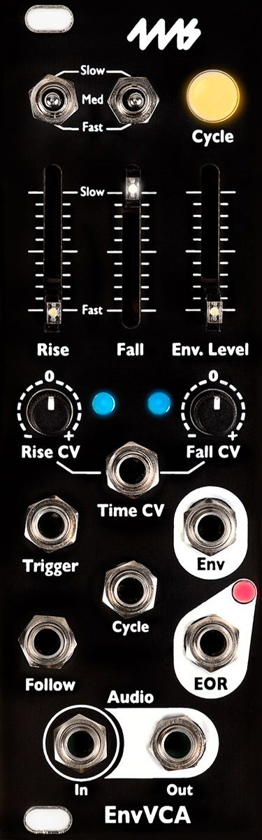 the envvca is a compact analog envelope generator with a built-in low-noise exponential vca. it's a perfect companion to any vco, whether you trigger it or self-cycle, and/or use the envelope output to modulate something else. with a wide time range from 30