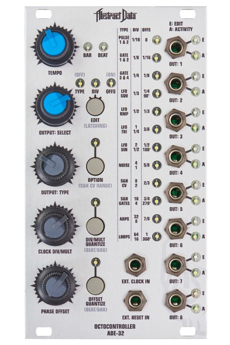outputs can be set to any clock division or multiple from 1⁄16 of a beat to 16 bars and can be offset up to 360 degrees.