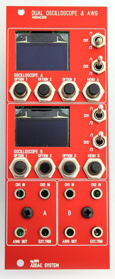this is a compact module with two dual channel oscilloscopes, allowing you to visualize your waveforms (voltages and audio) on two high-contrast oled screens. you get two channel inputs per oscilloscope and