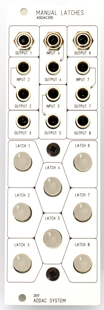the addac305 manual latches is a combination of 8 manual latching switches in a small and elegant module: each button toggles between gate high / gate low when pressed, outputting a 5v gate signal.