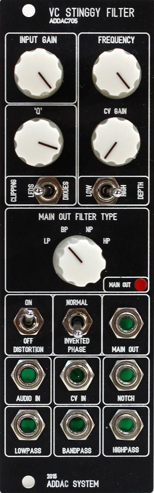 four diferent filter types: low-pass, band-pass, notch-pass and high-pass with independent audio outputs.