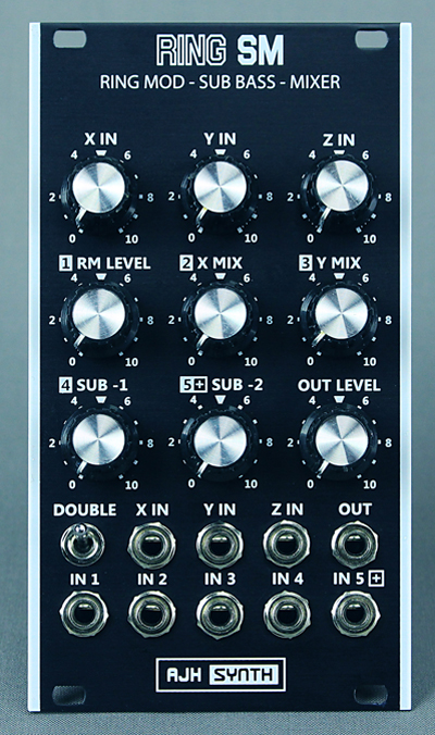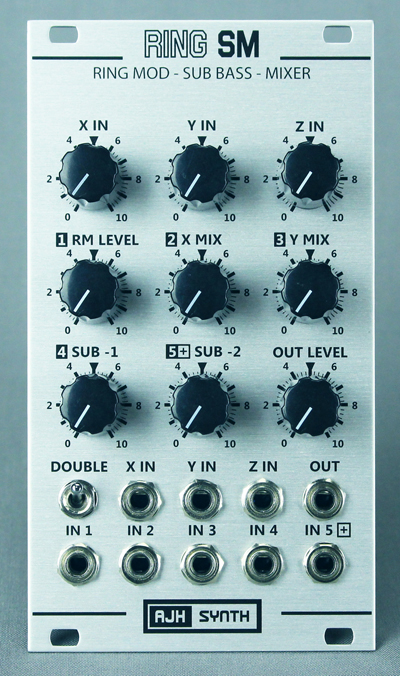 the ajh synth ring sm is a unique new eurorack module that features a three input discrete transistor ring modulator core, two shaped sine sub bass generators and a five channel discrete transistor mixer