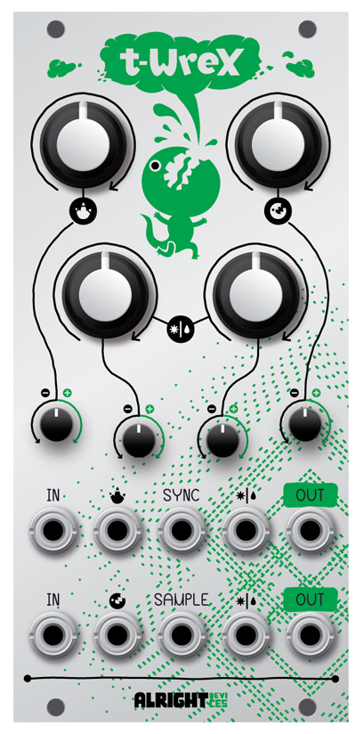 t-wrex provides an attenuverter on each cv input for your wiggling convenience. crank the chomp attenuverter fully counterclockwise to make the decimator's internal vco track its cv at 1v/octave!