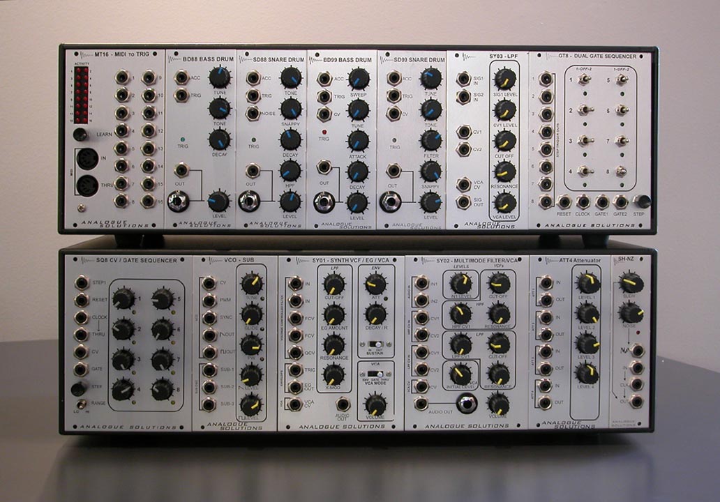 |  analogue solutions : concussor modular synthesiser analogue solutions concussor modules are the same physical size and use the same power connectors as doepfer a-100 modules. they will mount in doepfereurorack cases and are 100% compatible when patching. the following analogue solutions modules require +5v power: bd99, cb88, hh88, m2cv, mt16,gt8 and sq8. when using them in a doepfer case, an a-100 ad5 +5v adaptor board is required.