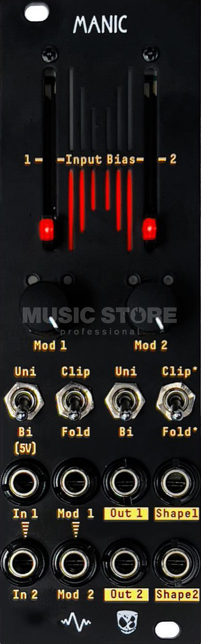 in collaboration with divkid, manic introduces an exploration of dual channel mono, mono to stereo or true stereo modulation and sound shaping within a sleek 8hp module designed for both creative freedom and technical precision. each channel offers precision linear vca functionality with traditional unipolar amplitude control or bipolar behaviour for complex ring modulation effects. while we all need more vcas! the secret sauce lies in the post vca shape outputs.