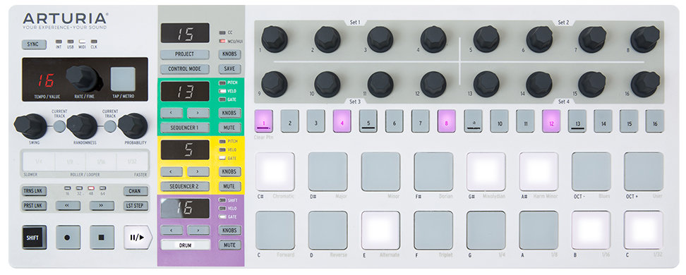 with beatstep pro you are master of the performance, taking full control of virtual devices, analog and digital instruments, drum machines and ipad apps all at once. 16 projects are instantly accessible, each of which contains 16 sequences per melodic sequencer and 16 patterns for the drum sequencer. that's over 4000 possible combinations per project!
