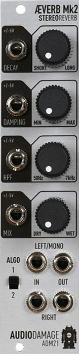 æverb mk2 has two algorithms, selected by the algo switch. the first is an extended version of the original algorithm, with much longer decay time (or "rt60 time," in reverb vernacular) and heavier