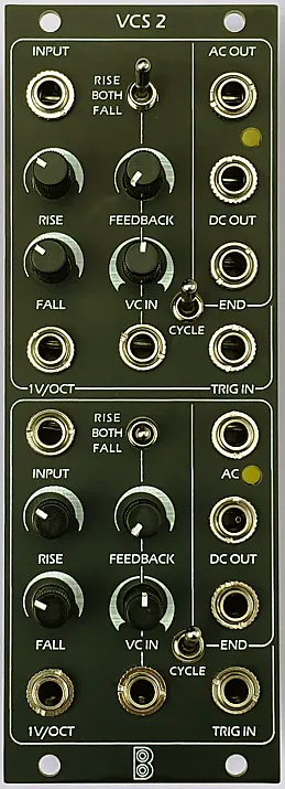 the vcs 2 is a unity gain voltage follower. the rising and falling slopes are independently and jointly voltage controllable over a wide range. an extremely versatile module, here are some patch ideas for creating and modifying cv and audio: