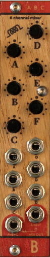 abc is a simple 6 channel signal mixer. it has 6 inputs - a,b,c,d,e and f - and two outputs - a+b+c - which is mixed in to the d+e+f output if nothing is inserted in the a+b+c jack. abc is designed to mix audio