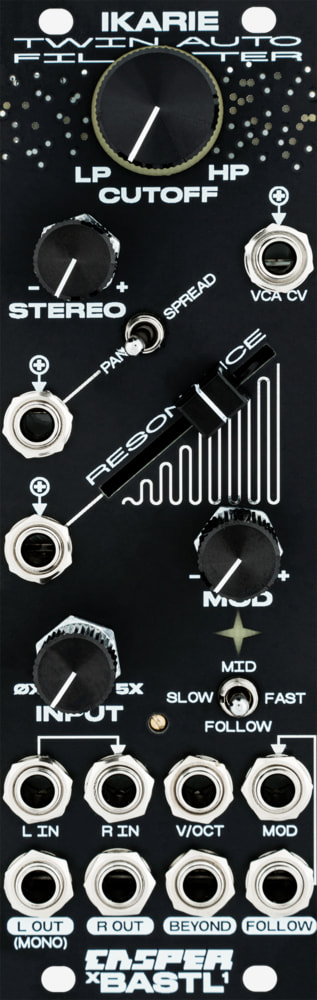 ikarie is a uniquely sculpted, flexible stereo or dual peak filter module. it can continuously transition between lowpass and highpass filtering with a single knob. it also packs in an envelope follower for the incoming audio signal, which comes in handy