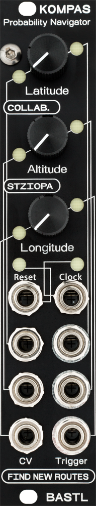 kompas is a three-coordinate probabilistic pattern navigator. each coordinate has a unique traveling pace and a dedicated trigger output. the amount of probability can be adjusted manually or by external voltages. once a coordinate has been adjusted, a new
