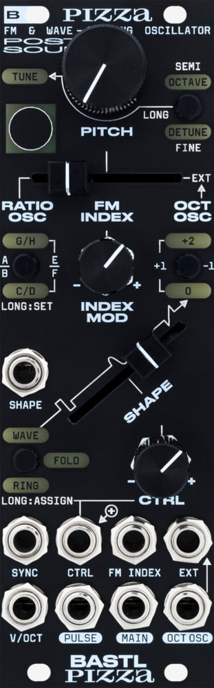 pizza is built around 3 internal oscillators - the main oscillator, which can be phase modulated (fm) and wave folded, and two modulating oscillators. the modulating oscillators are the octave (sub) oscillator, with dedicated output, and the ratio