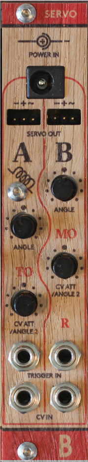 trigger/gate input which changes between two different angles set by the knobs or cv input which controls the angle of servo directly. for cv inputs the second angle knob works as attenuator.