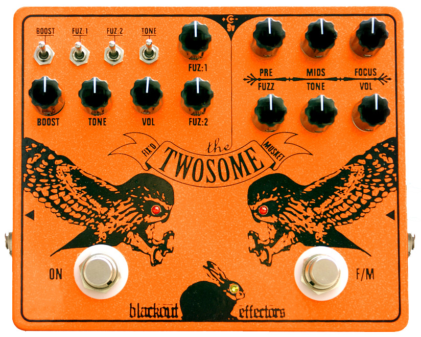 the twosome is a meaty fuzz sandwich made up of the musket fuzz pedal and the deluxe version of the fix'd fuzz pedal. both circuits run independently in an a/b configuration