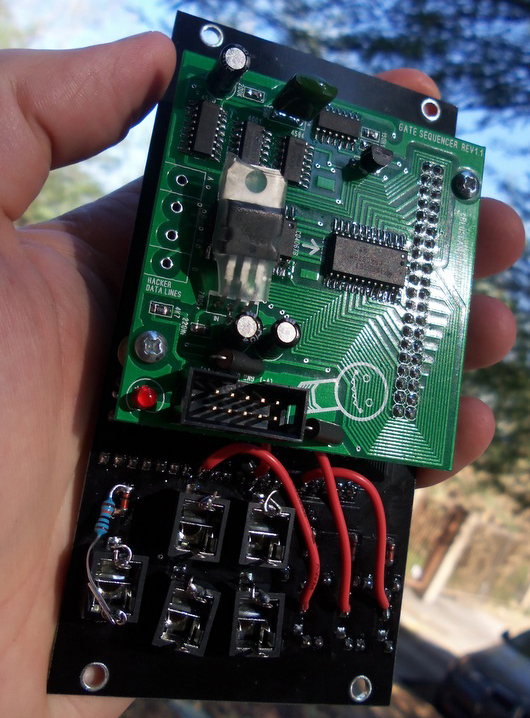 triggering percussion modules, for example, or sequencing events. there are two gate outputs, though they run off the same sequence. the module is skiff compatible: 1.25" clearance recommended (the module