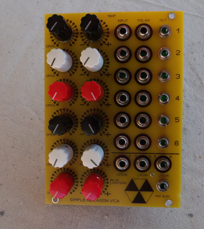 the blue lantern simple hexagon vca provides six voltage controlled amplifiers, each with their own attenuators for initial level and cv amount. the onboard attenuators mean less clutter and fuss from patching