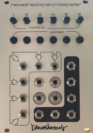 follow the arrows on the cv inputs 1 through 6 to see the direction of crossfade on the center inputs. outputs are in black.