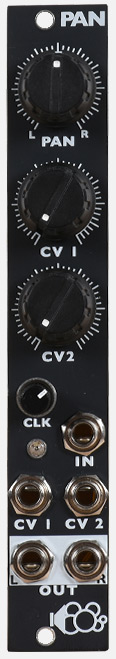 pan is a single input panning module. the clk pot is the rate for a built in lfo with a range of 15 seconds to 175hz. the lfo's triangle output is normalized to cv1. since pan is based around a pair of vcas