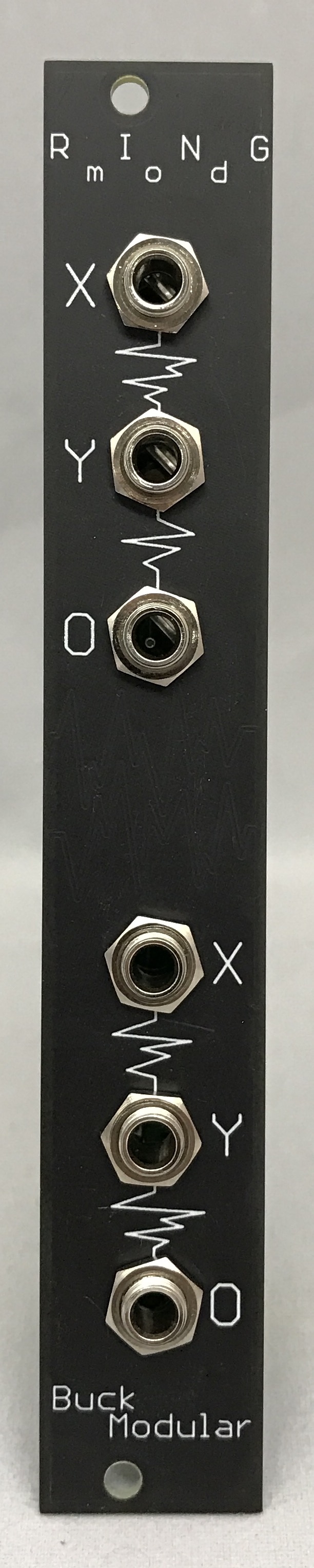 the ring mod is a 4hp classic diode/transformer passive ring mod circuit. x/y inputs & o outputs (x x y=o). chaining the output (o) of channel one into the x input of channel two can