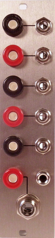 5x banana jack to minijack 1x banana jack to 6,3mm jack 1x banana ground specifications: 6hp dimensions: 128,5mm x 30,2mm depth: 18mm