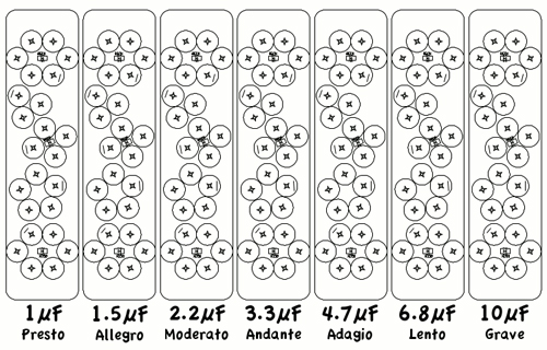 solder-worker to construct her own idiosyncratic assemblage of geometries, with assortments of capacitors based on what was on at hand, or strict dogmata, or pure whimsey. when the concept evolved into a