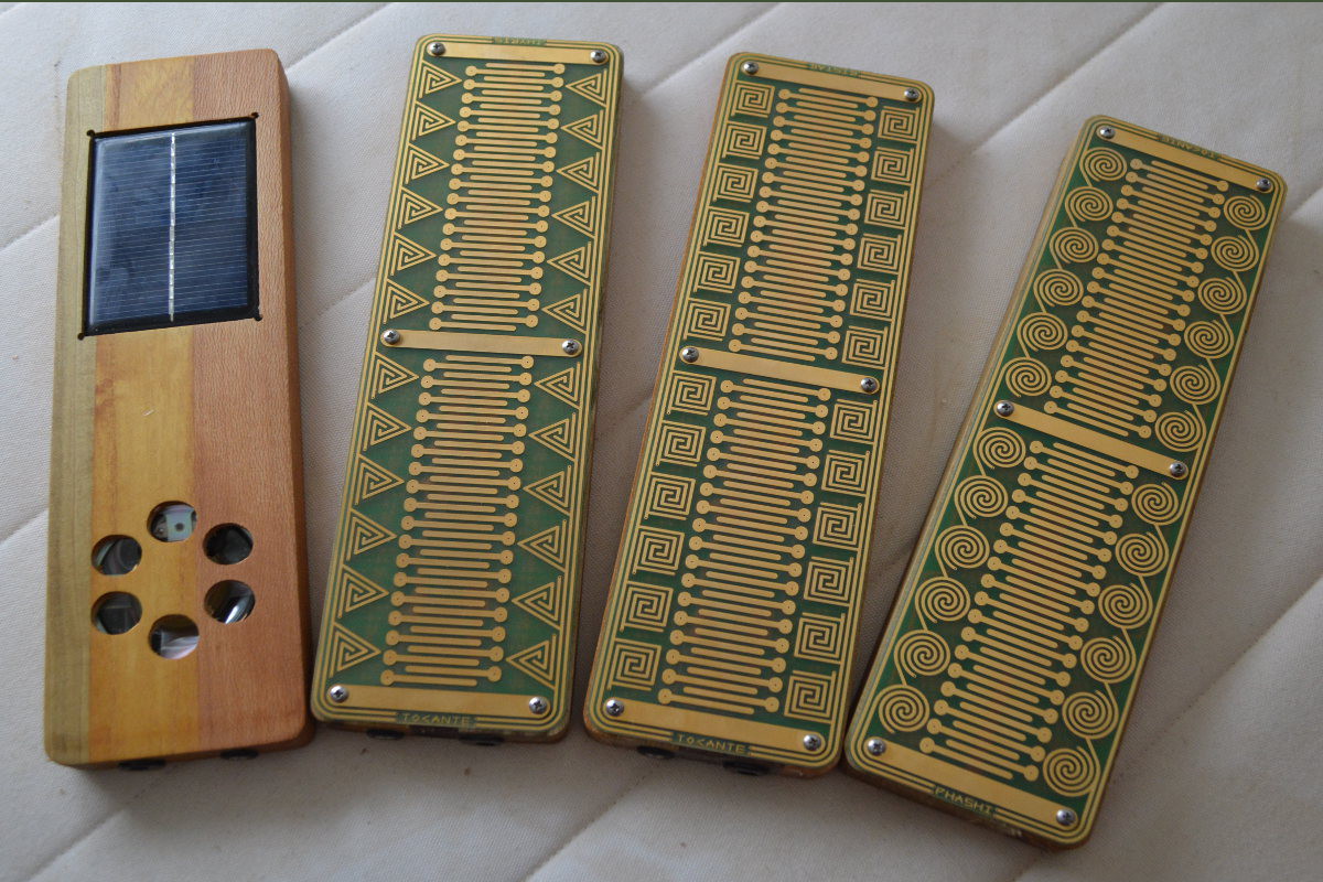 phashi the circle. the oscillators sound like a bowed string, a most powerful clarinet, and a howling serene whistle, respectively. each responds to touch differently. solar panels charge the onboard batteries,