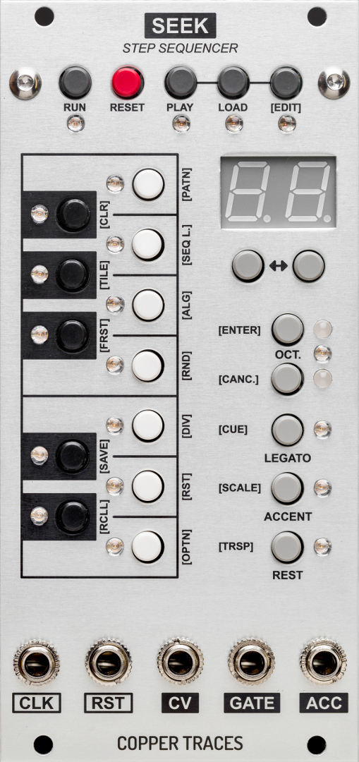 seek is a 64 step cv/gate sequencer with legato and an accent output. the easy to use yet compact interface allows for quick sequencing of complex, carefully crafted melodies. the multipurpose reset input,