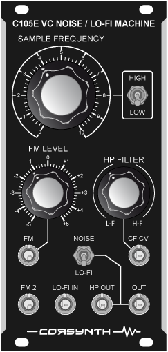 the c105e vc noise / lo-fi machine is a voltage controlled analog sample rate reducer with an internal white noise generator and a voltage controlled high pass filter (12db/octave) with an independent