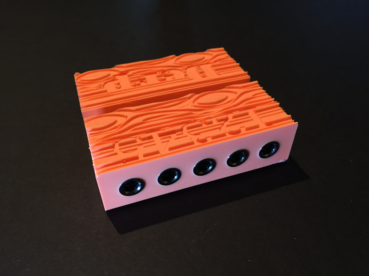 | this is a five-channel derp block performance connector with five 3.5mm and 1/4" inputs on opposite sides of the block. available colors are: aluminum (grey), blue, green, orange, and purple. the colors glowbrightly under a black light (except aluminum). derp are hand-made in california, usa by wigglers. |