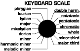 16 keyboard scales can be selected by the key scale switch. they include all musical modes, various harmonic scales, and several specialized scales. the modes are arranged so that each scale is only one