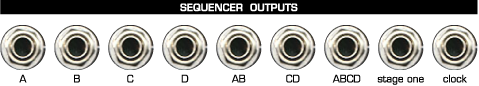 there are six outputs for the sequencer: one output for each row (a-d), a stage 1 trigger output and a clock output which runs at the same rate of the stages. the other three outputs are explained below in