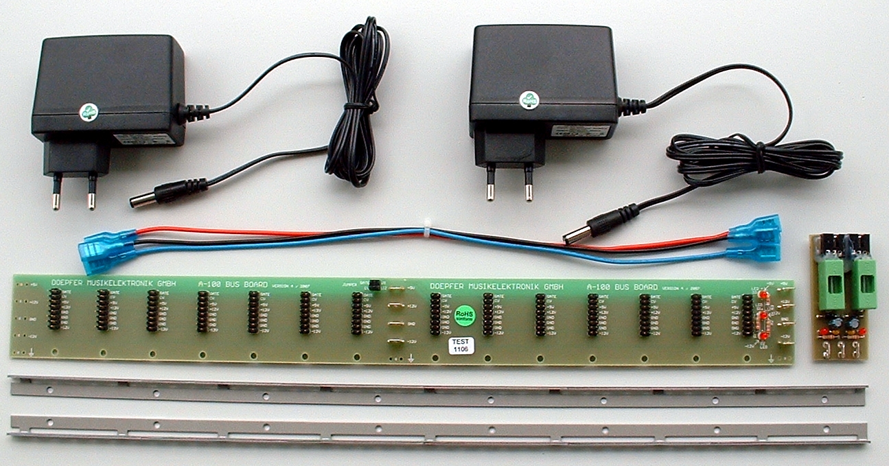 very low cost beginners package for usage in combination with two external 12v wall-outlet power supplies because of safety reasons, no dangerous voltages accessible max. current: 500ma one bus board two 84 hp mounting rails with threads for module mounting (sufficient for one 3 u case) two 12v wall-outlet power supplies with 500 ma each (stabilized wide range switching power supplies with ac input range 100...240vac, european type mains plugs) cable and adapter board for connections between power supplies and bus board building suggestion for wooden case (sketch + list of all required wooden case parts) additional installation material like screws, nuts or distant bolts (e.g. for bus board, adapter board, rails) is not included as these parts depend upon the type of case built by the customer the technical documents are available as pdf file. |