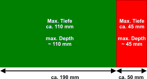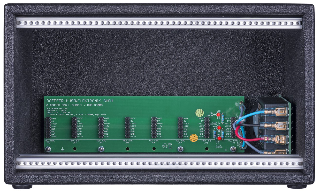 inside: 1 x 48 hp (244 mm) x 3 u (one short bus board), useable depth for a-100 modules: approx. 110/45 mm (measured from inner side of the front panel until end of the pc board of the module), because of the built in power supply the