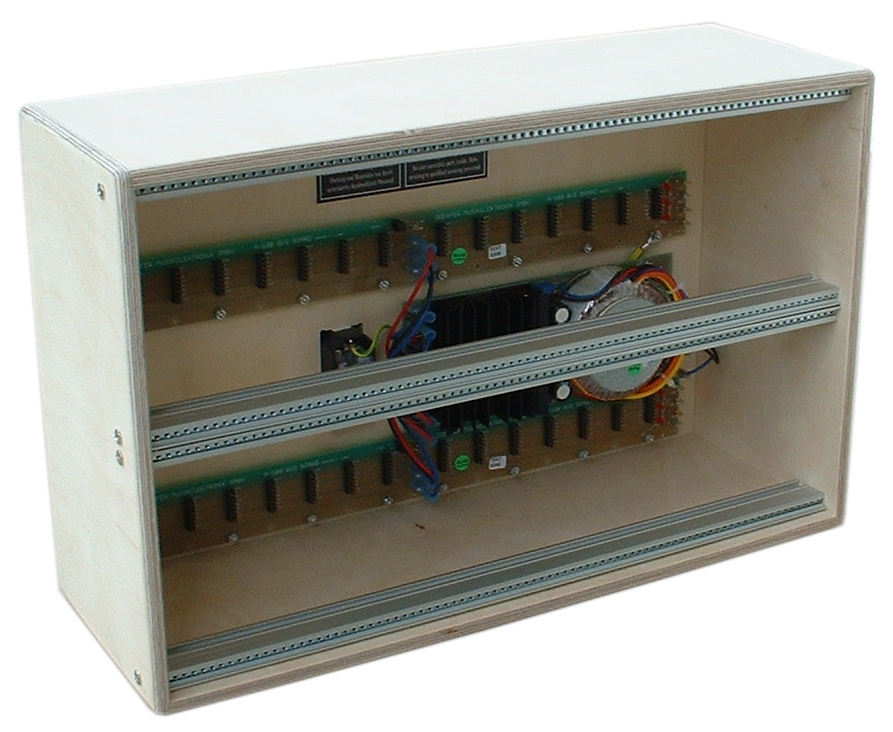 the housing is produced with a net entrance at the back. the price is approximately 35% under that of the regular a-100p. dimensions: outside approx. 445 x 275 x 160 mm , inside: 2 x 84 width unit x 3 he,