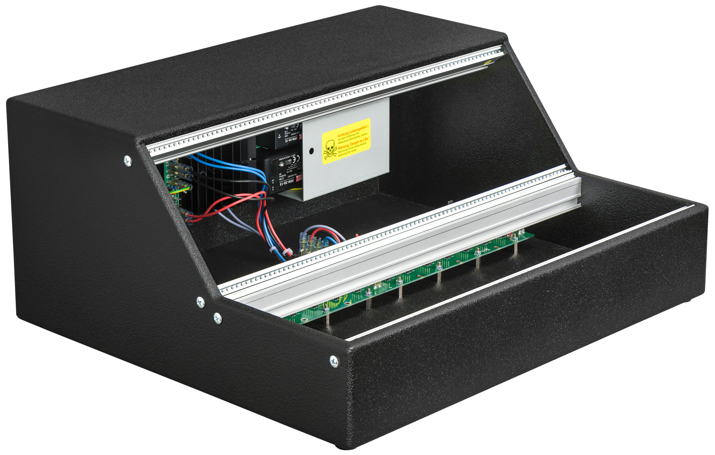 the a-100 low cost base has two rows for modules available: one with horizontal alignment and another 45 degrees inclined row. the useable width is the same as for the low cost cases, i.e. 84 hp. the bus