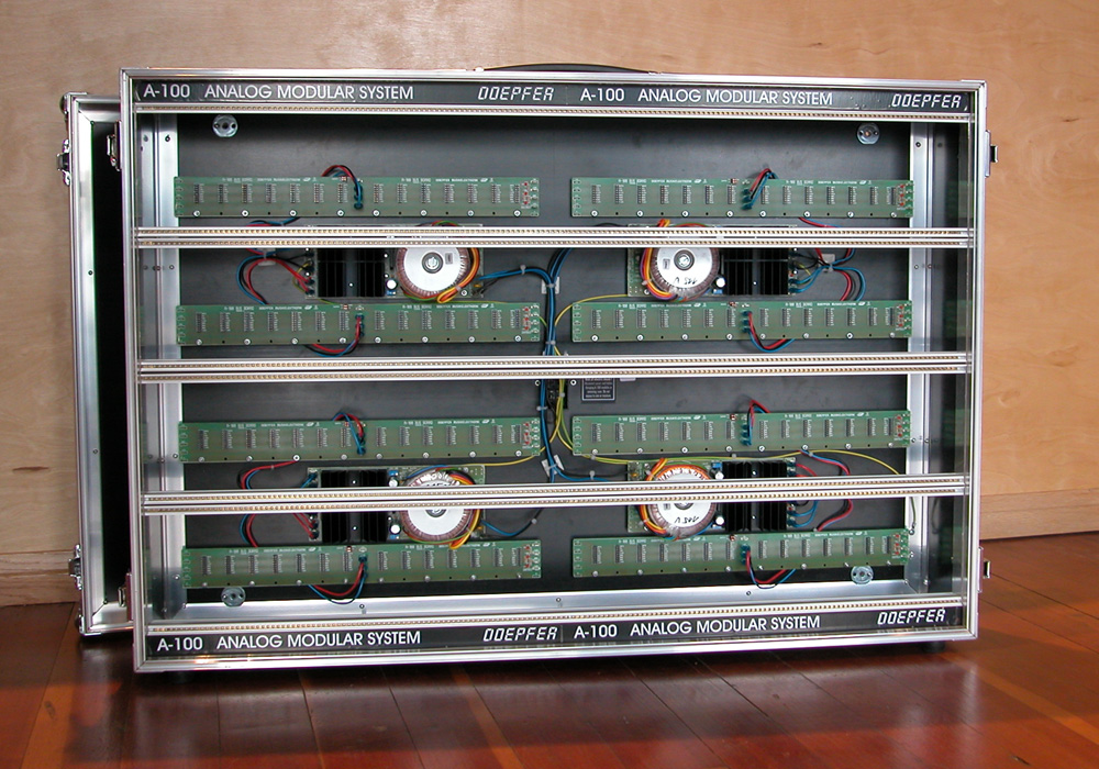 | as a special design the suitcase version of the a-100 frame is available even in a "monster" version with double width and height (168hp / 12hu). it can be chosen between a single and double version of themonster suitcase and even the monster cases are available in black or grey. for the double version the two suitcases are fixed together face-to-face during transportation so that no covers are required (asfor the single version). each monster suitcase is equipped with four power supplies with toroid transfomer/1200ma