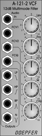 module a-121 is a voltage-controlled multi-mode filter with a cut-off slope of -12 db / octave. four simultaneous outputs are available, each with different characteristics: low-pass, band-pass, high-pass