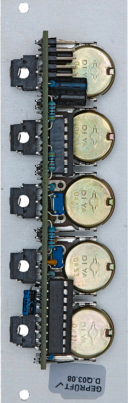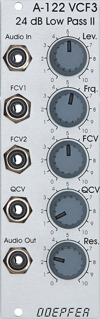 module a-122 (vcf 3) is a voltage-controlled low-pass filter, which filters out the higher parts of the sound spectrum, and lets lower frequencies pass through.