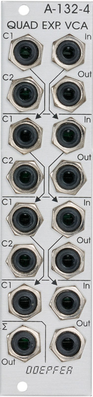module a-132-4 contains four identical voltage controlled amplifiers (vca) with exponential control scales. each vca has two control voltage inputs (c1, c2), a signal input (in) and a signal output (out). the
