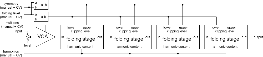 clipping levels of the wave folder units are controlled. the harmonics parameter (manual and ext. cv) adds some harmonic content by sharpening the waveform edges and adding overshoot peaks. it works a little