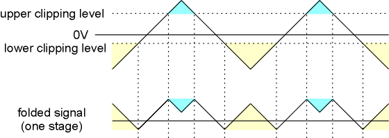 the incoming signal of each stage is folded back as soon as the signal level goes beyond the upper clipping level resp. is folded up as soon is goes below the lower clipping level (a-136 users will know this