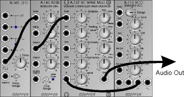 parameter is controlled by an adsr (a-140) that is triggered by a lfo (a-145). in the first example envelope time and lfo period are short, in the second example a bit longer. in the third example envelope