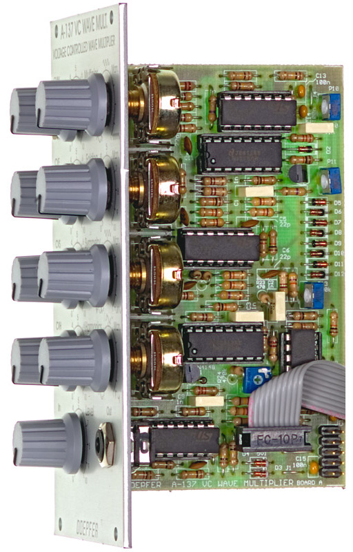 the a-137 is a voltage controlled wave multiplier. the basic idea of a wave multiplier is to multiply the waveform of an incoming signal (e.g. triangle/saw/sine from a vco) within one period of the waveform.