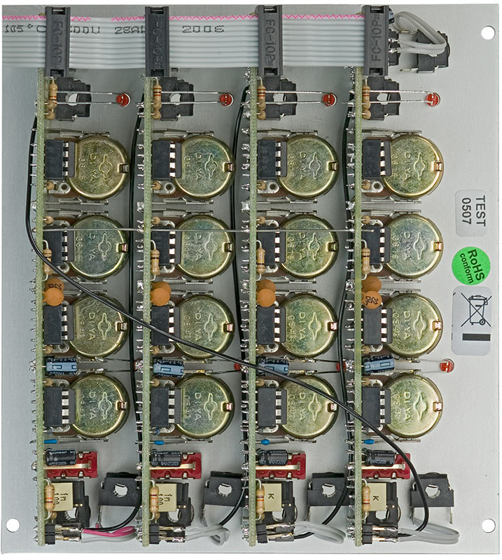non-inverting with adjustable level to the mix output. additionally a single output (env 1...4) is available for each unit.
