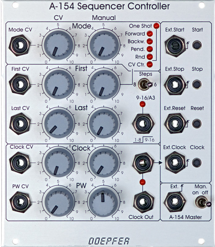 a-154. this output remains "low" as long as the active step is in the range 1...8 and turns to "high" in the range 9...16. the a-150 is used to switch between the cv/trigger/gates outputs of