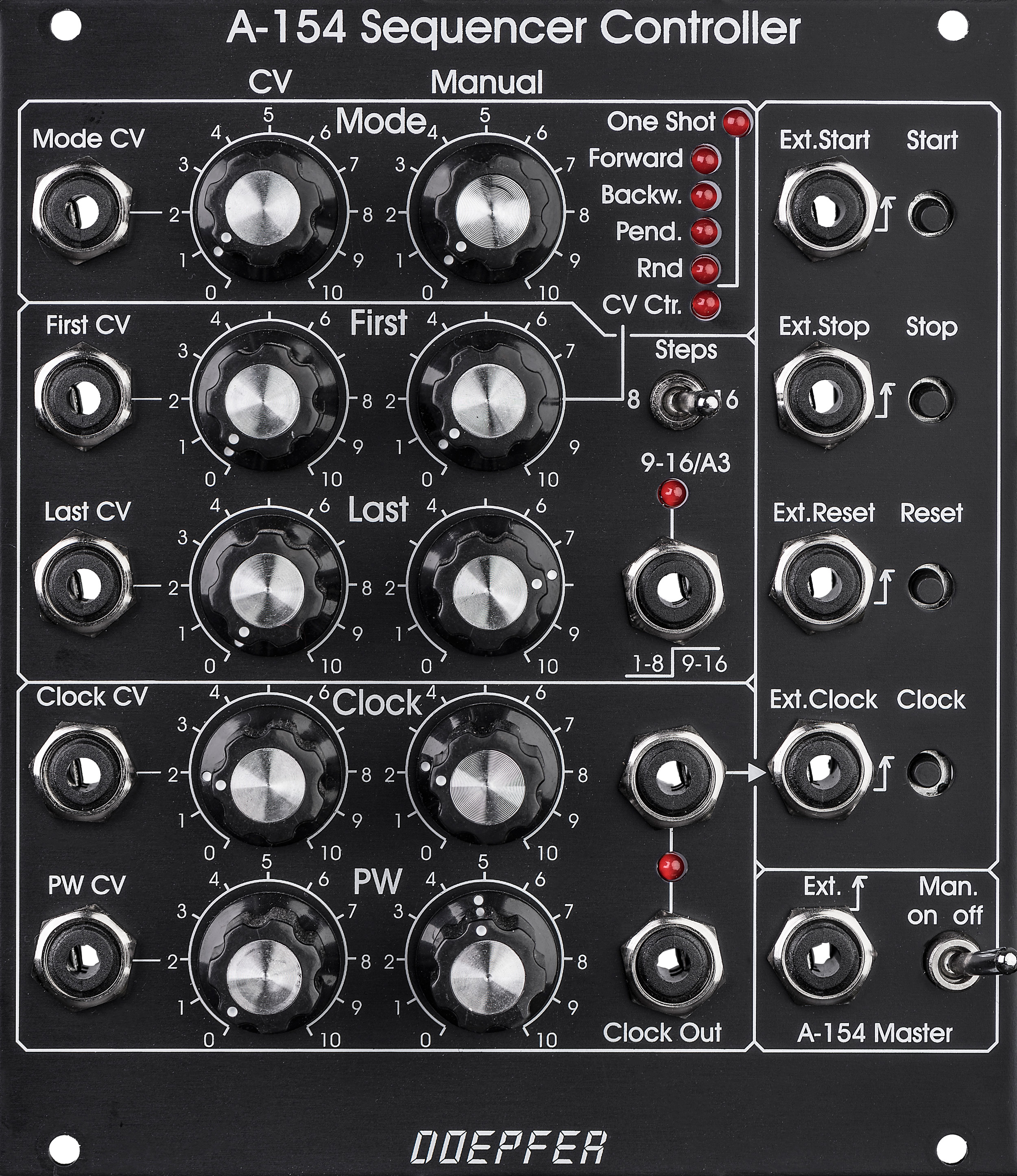 manual and voltage controlled selection (with attenuator) of first and last step of the sequence. the range is step 1...8 in 8 step mode resp. 1...16 in 16 step mode